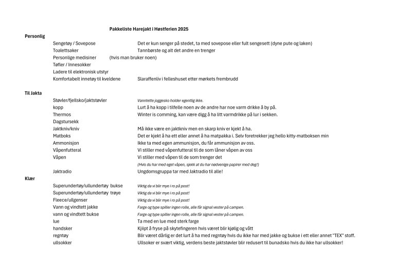 Vi lager forslag til pakkeliste og sender ut den uka før!