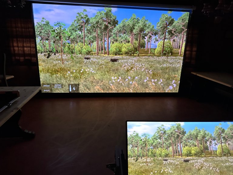 Årets store nysatsning for medlemmene er en Simway skytesimulator. Her kan du ha det gøy og trene deg opp til å bli en enda bedre skytter. Det er flere skytesimulatorer på markedet, men den vi har kjøpt, er nok av det beste man får. Her kan du skyte både med rifle og hagle, og du har mulighet til å velge hva du vil skyte på. Alt fra bjørn, via elg, til rype for stående hund. Du kan velge om du vil låne våpen som hører til simulatoren, eller om du vil bruke ditt eget våpen og få en enda mer realistisk trening. Vi har laserpatroner i flere kalibre. Det er mange ulike muligheter med simulatoren. Du kan velge å skyte alene, eller du kan konkurrere med andre. Når du har skutt, får du se hvor du traff, og du får vite om skuddene var dårlige eller dødelige.