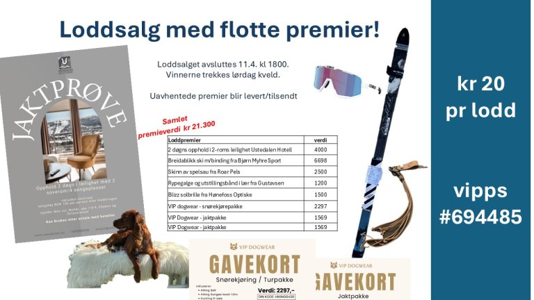 Loddsalget avsluttes kl 1800 lørdag kveld. Uavhentede premier blir tilsendt. Kun kr 20 pr lodd! Vipps til #694485