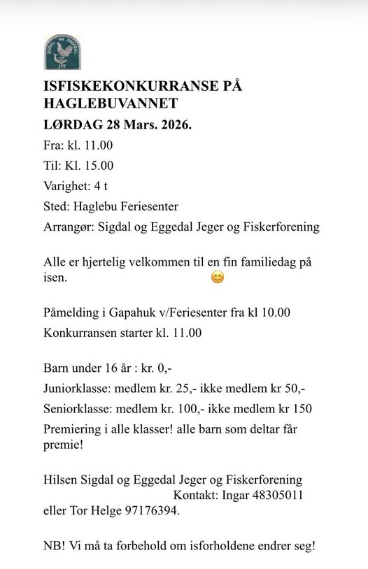 Påmelding til Ingar på tlf. 48305011 eller Tor Helge på tlf. 97176394