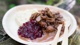 Server finnbiff med potetmos og tyttebær.