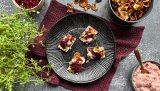 Gravet orrfugl med tyttebæraioli, ruccula og jordskokkchips på speltkjeks er en munnfull du bare må teste. Perfekt til forrett eller et tapasbord.