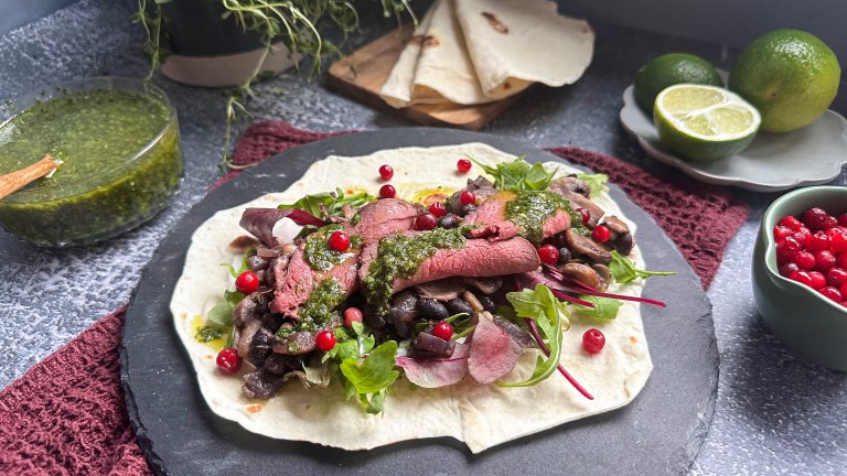 Server harekjøttet med spicy tyttebærmajones, syltet rødkål og grønt tilbehør som spirer, brokkoli og salat på lefser, pinsa eller pitabrød.