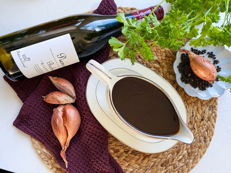 Server helstekt ytrefilet med rødvinssaus, rotmos, perlepoteter, stekt sopp og tyttebær.