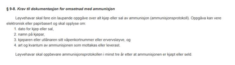 Krav om ammunisjonsprotokoll er fastsatt i våpenforskriften §9-8