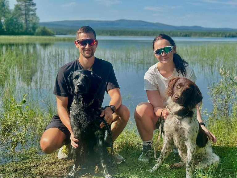 Fritiden blir brukt til familie, trening, hund, jakt og fiske.