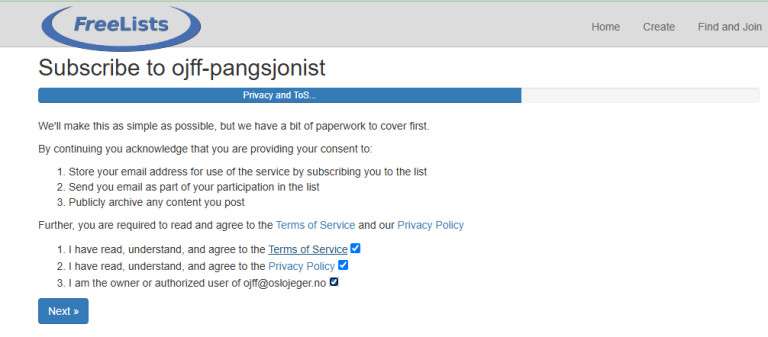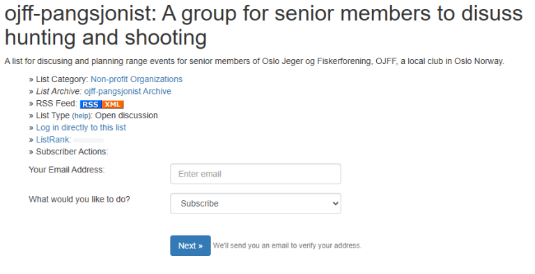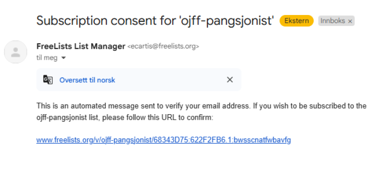 Brukeren (du) må godkjenne påmeldingen (to-trinns godkjenning) ved å klikke på linken i eposten som mottas etter at epostadressen er lagt inn. Husk! Når du er medlem på listen kan du også sende epost til alle (om du har et spørsmål eller ønsker en diskusjon om noe) så det oppfordres til godt språk.