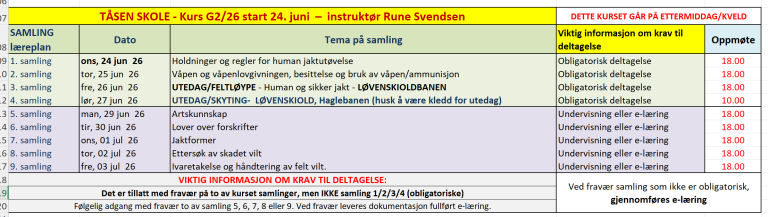 Læreplanen for jegerprøven er over ni samlinger (30 timer). I praksis syv samlinger med teori på Tåsen skole + to samlinger utendørs, hvor en av disse to er skytesamling. Du finner oversikt over kurs og alle samlinger nedenfor.