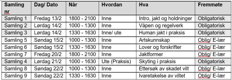 Kandidaten kan ha fravær fra undervisning på inntil 2 samlinger, men bare fra samling 5, 6, 7, 8 eller 9. Ved fravær skal kandidaten levere dokumentasjon til instruktøren for bestått test fra e-læringa for denne samlingen. Du kan ikke bli meldt opp til Jegerprøve-eksamen før du har gjennomført alle samlingene.