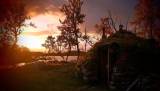(Ved gammen ligger det en båt. Denne skal ligge på land når du forlater gammen. Årene skal stikkes inn under benkene i stua. Husk flytevest.)